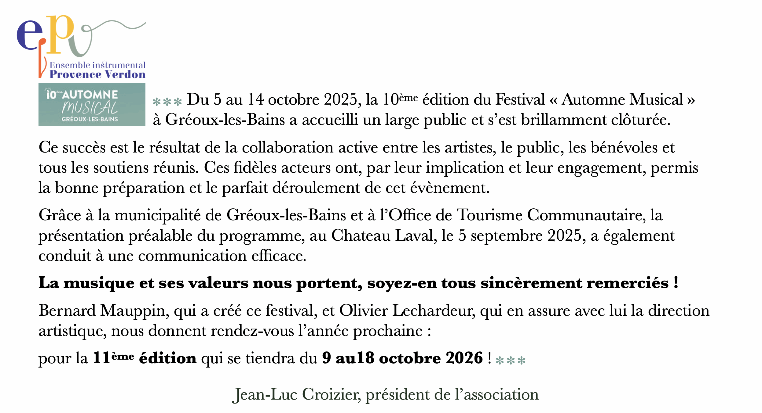 L’Ensemble Instrumental Provence-Verdon a produit de très nombreux concerts en région Sud, salués par tous, ainsi que trois tournées en R.P de Chine. Depuis 2016, Il est porteur sur la ville de Gréoux Les Bains- partenaire privilégié de l’Ensemble- et la communauté de communes de la D.L.V.A , du festival « Automne Musical » qui invite quelques grands noms de la scène internationale musicale pour des programmes exceptionnels, ainsi que des classes d’interprétation destinées à des étudiants de 3ème cycle. Egalement plusieurs concerts en partenariat avec la Ville de La Roque d’Antheron dans la prestigieuse Abbaye de Silvacane ont établi un lien apprécié de tous.